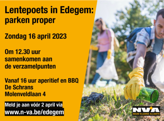 Samen met onze jongerenafdeling organiseren we een grote lentepoetsactie in Edegem. Vlak voor het warme zomerseizoen zodat iedereen weer optimaal kan genieten van onze mooie stukjes groen om er in te wandelen, te spelen, te picknicken, … Kortom om in te genieten! Hierbij een oproep aan elke Edegemnaar om mee met ons de parken en perkjes in alle wijken op te ruimen. Wij voorzien allerlei opruimmateriaal van Mooimakers. Vertrekken doen we vanuit de vier wijken om allen te eindigen in De Schrans. We verzamelen om 12.30 uur op vier verschillende punten de vier wijken: